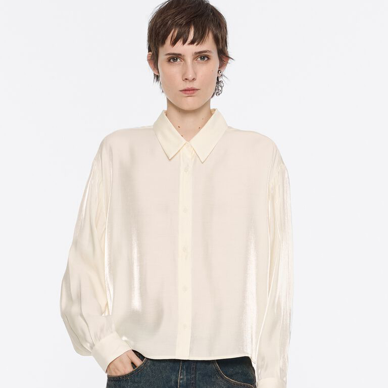 Tejido plano camisero liviano en mezcla de rayón y nylon, con mano suave y acabado brillante tipo shimmer/glossy