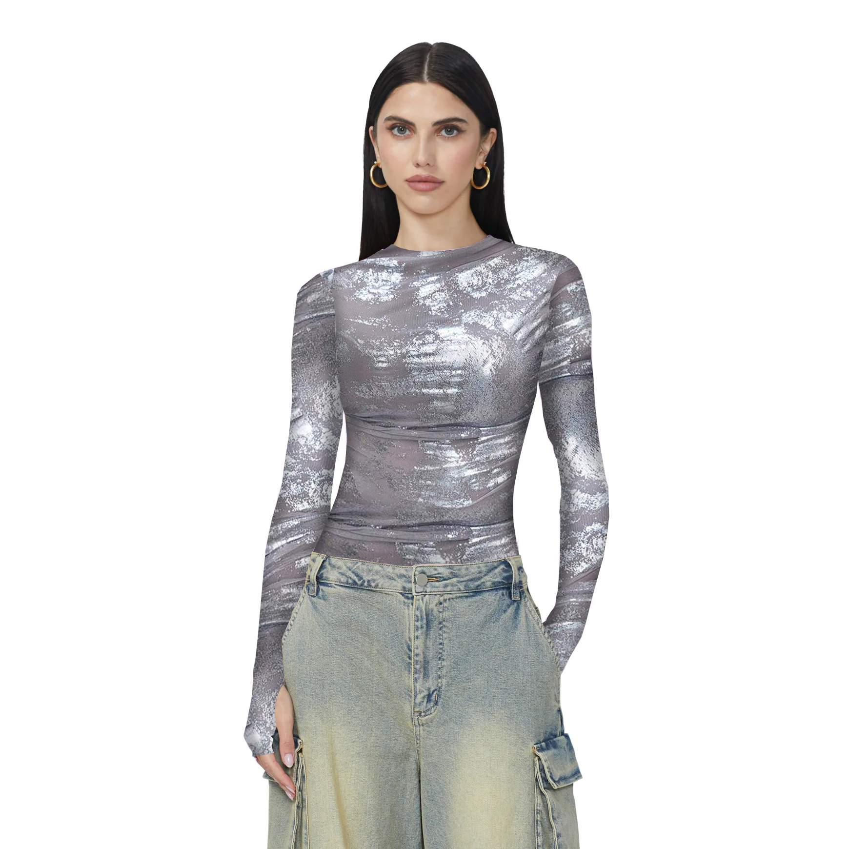 Microtul con efecto marmolado metalizado que aporta brillo y sofisticación. Su transparencia delicada y un foil plateado que genera un impacto visual moderno y vanguardista